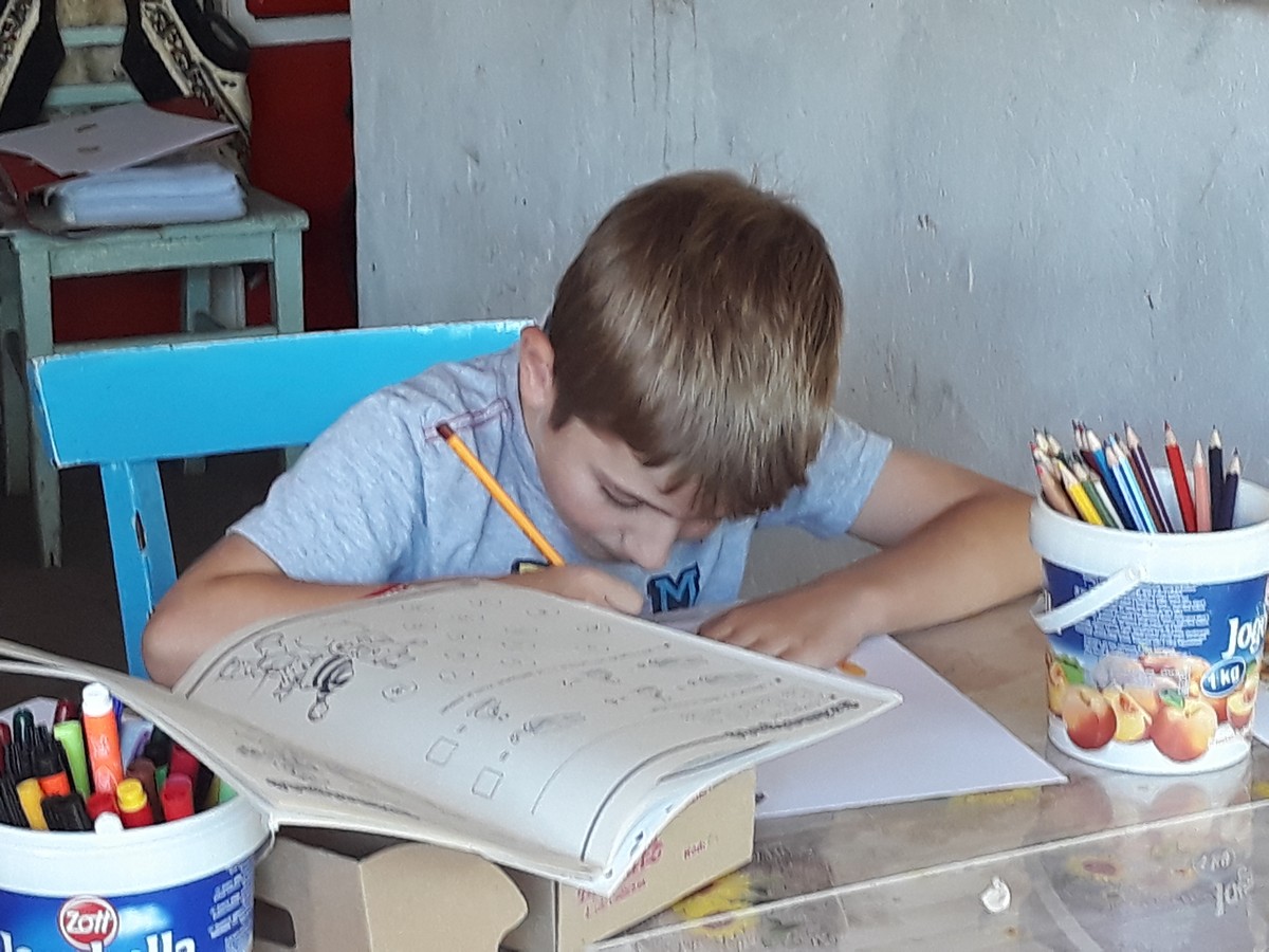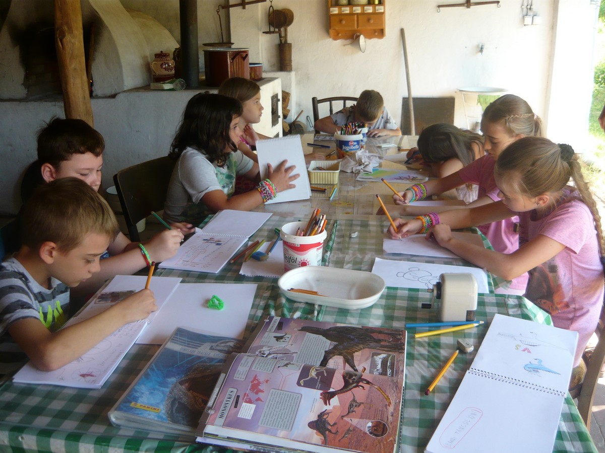 Vidáman telt a múlt héten a 8-10 évesek rajzos, alkotó, kreatív tábora a Veresegyház Fő útjának mentén épült házikóban. Ha Fő út, talán sokan azt kérdezik magukban, hogy egy autók zajától hangos helyen hogyan lehet nyugodtan alkotni? Pedig lehet! Mert amikor a zöldre festett fa kapun bementünk, mintha nemcsak a “küszöböt” léptük volna át, hanem az éveket is…, sokat…., visszafelé. Belecsöppentünk a múltba, az autók zaja megszűnt, egy csöndes, nagymamáink, dédszüleink korát idéző hangulatos parasztporta várta öt napra a tábor résztvevőit. Ebbe a nyugalomba a gyerekek örökmozgó lábacskái behozták a modern kor nyüzsgő világát, a porta pedig belopta békés nyugalmát a gyerekek folyton pörgő mindennapjaiba. Egy igazán kellemes szimbiózis alakult ki.